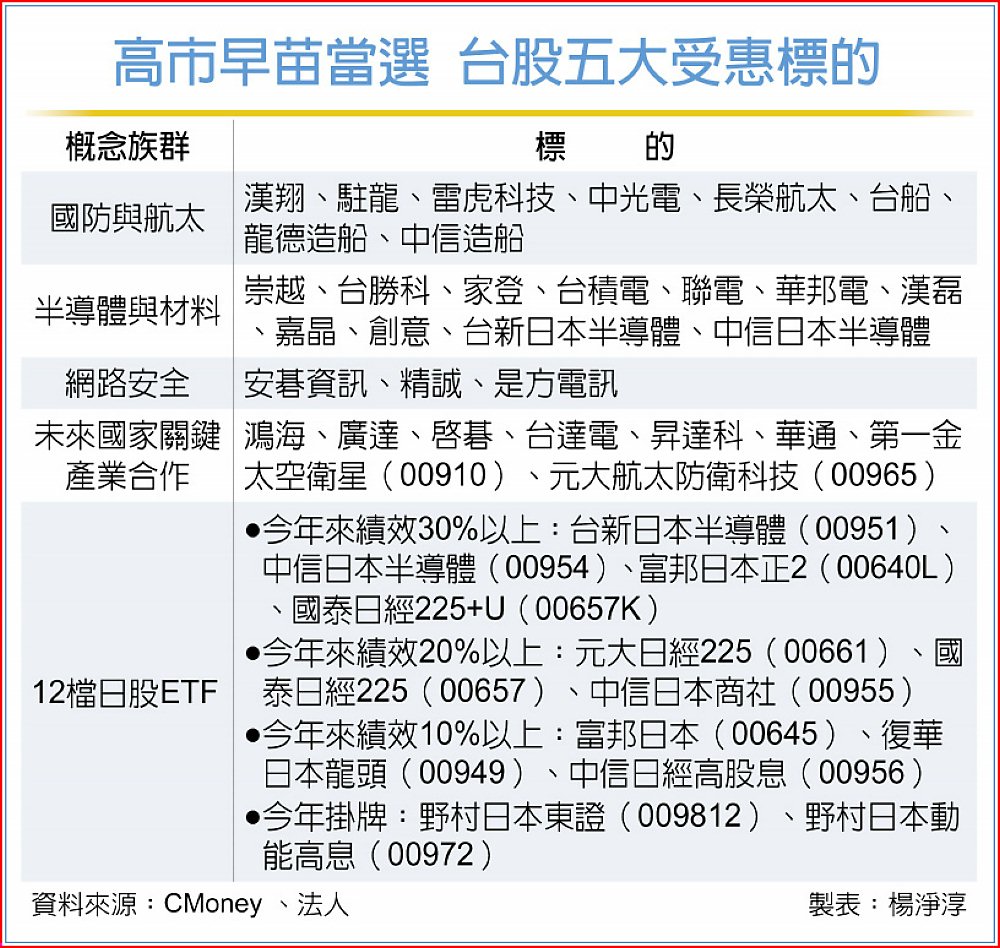 高市早苗可望成為日本首位女首相,因其主張升息延後,日股贏來慶賀行情,成為亞股中表現最為強勁的股市,可觀的資金行情亦助力台股7日衝高。法人表示,高市早苗若出任日本首相,台股的日股ETF、國防、半導體、網路安全、未來國家國力發展關鍵產業等五大概念標的也有望受惠。