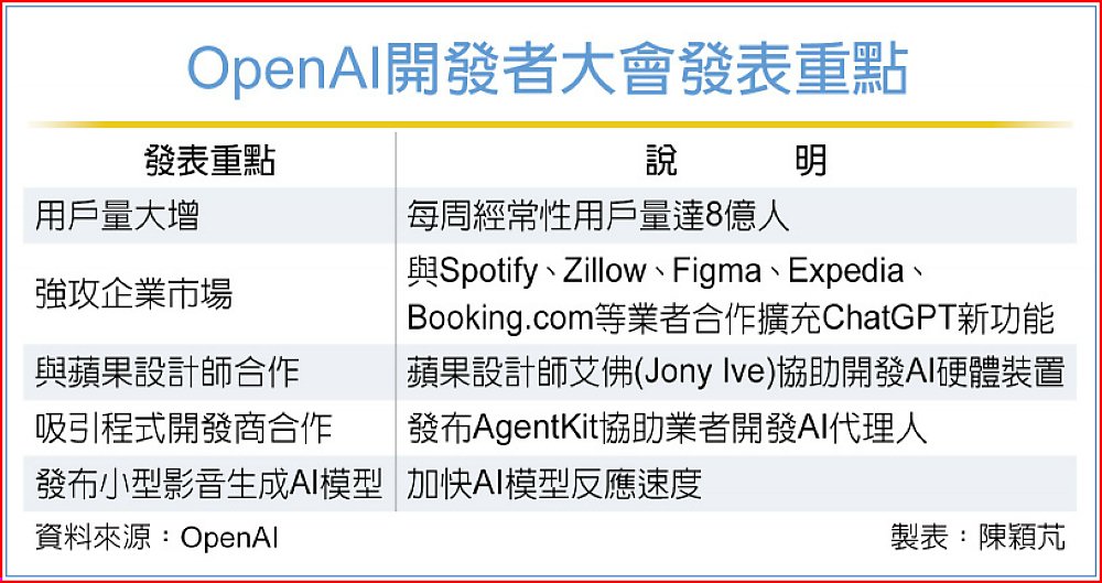 OpenAI執行長奧特曼(Sam Altman)7日在年度開發者大會(Dev Day)上宣布,ChatGPT每周活躍用戶已突破8億人次,並表示OpenAI陸續和Spotify、Zillow、Figma等業者合作擴充ChatGPT功能,瞄準企業市場。