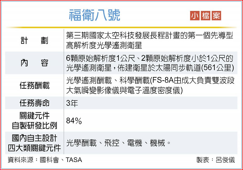 這次福衛八號星系首顆衛星,也首次由總統進行命名為「齊柏林」。吳誠文說,福衛八號包括關鍵晶片、光學鏡片、複材結構、天線到推進、姿勢與軌道控制系統(AOCS)、GPS接收機等關鍵元件,都由國內產學界自主研製,占整體關鍵元件比率84%。