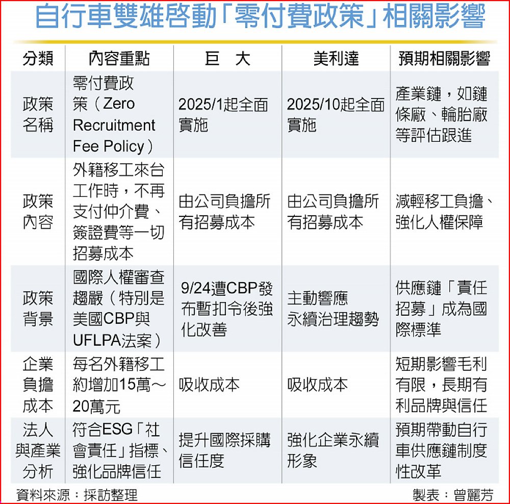 巨大集團9月24日遭CBP發布暫扣令,台灣廠製造的產品暫時不得輸美,雖巨大高層拚10月底前赴美釐清供應鏈管理流程並提出人權改善成果,但此事件已使產業意識到國際合規的重要性。如今,外籍移工仲介費「零付費政策」的推行,實為企業回應全球永續治理趨勢、重建品牌信任的具體行動。