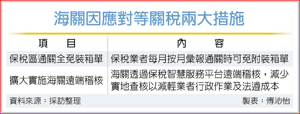 關務署說明,為減輕廠商受美國對等關稅衝擊,推出「保稅區通關全免裝箱單」及「擴大實施海關遠端稽核」二項簡化通關措施,前者指保稅業者每月按月彙報通關時,可免附裝箱單。至於後者,財政部說明,主要是海關透過保稅智慧服務平台,對業者擴大實施遠端稽核,減少監管海關實地查核,以減輕業者行政作業及法遵成本。