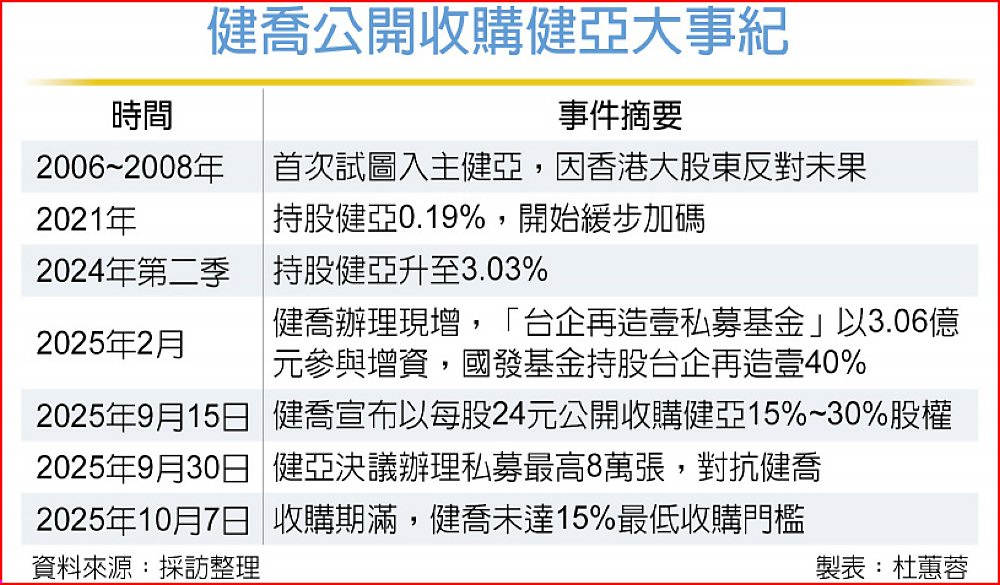 健喬擬以每股24元公開收購健亞15%至30%股權案,7日結果出爐,未達15%最低收購門檻,失敗告終。製藥業認為,健喬開出的收購價太低,且健亞股東對健喬欠缺信心,加上國發基金的角色被質疑,是此案破局的關鍵。