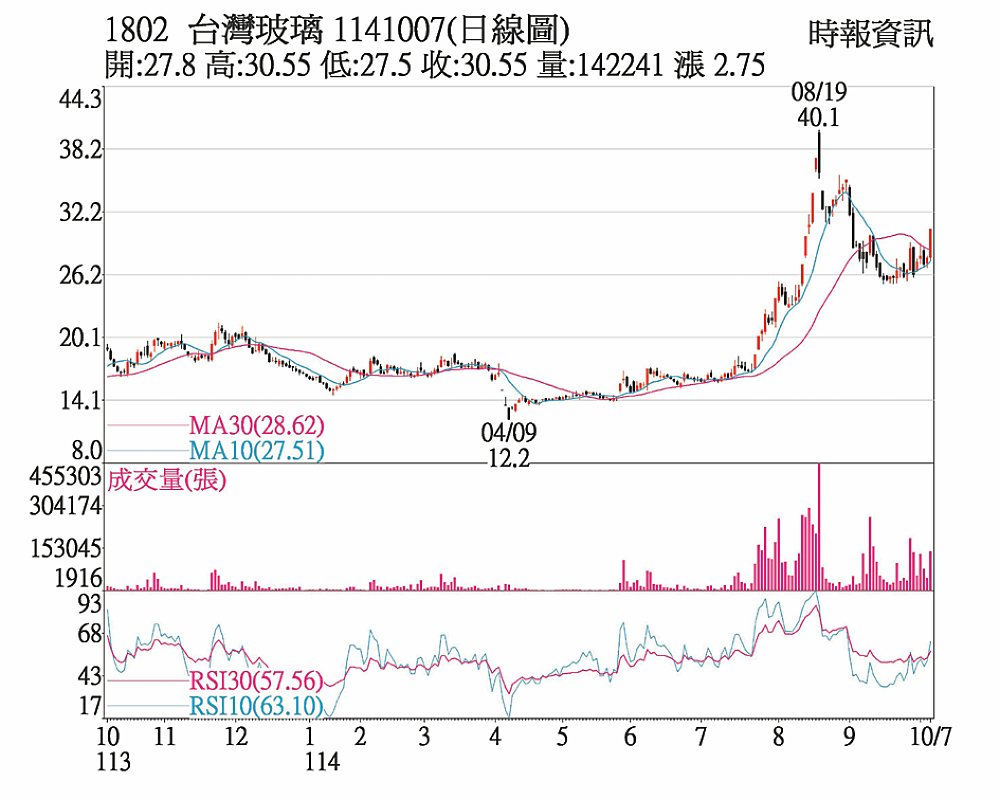 台玻(1802)7日股價放大量強攻突破5日均線、月線及季線糾結,收漲停30.55元。短期周線等短期均線趨勢都已反轉向上,9日KD值趨線維持交叉往上,各短多技術指標仍呈多頭排列,又已站上30元整數關卡之上。市場做多意願濃。近期量能如能保持在高檔之上,短線將向35元整理區間挑戰。