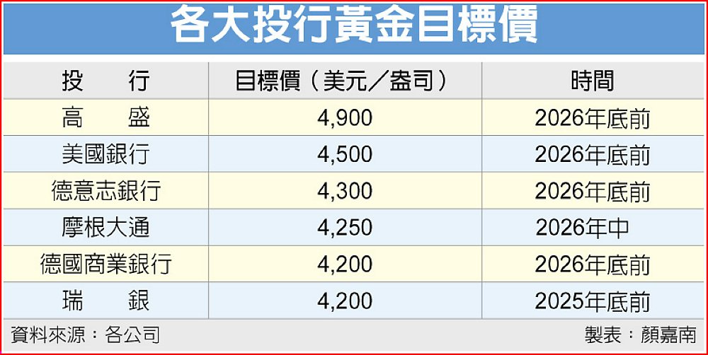 星展銀行將2026年上半年黃金目標價從4,000美元上調至4,450元,主要假設明年上半年美元指數為92.9,美國10年期公債收益率為4.2%。(相關新聞見A4)
