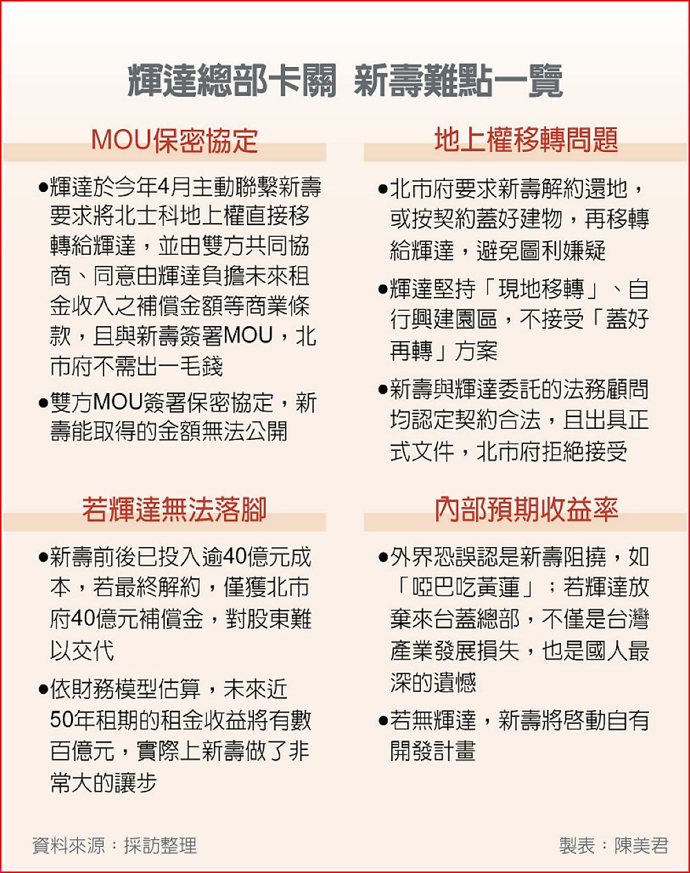 此外,新壽委託的理律法律事務所及輝達評估後,雙方均認定此方案合法,並出具正式意見文件,惟北市府依舊堅持會有圖利他人的風險而不願放行。相關人士憂慮,若未來輝達因故拂袖而去,外界不但將誤認並指責新壽從中阻撓,此案也恐成為國人心中的遺憾。