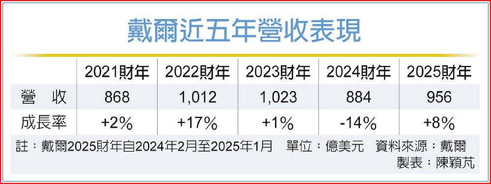 戴爾最新財測指出,未來4年營收年複合成長率可望達到7%至9%,高於先前預估的3%至4%範圍。未來4年調整後每股盈餘(EPS)的年成長率也從原本的8%上調至15%以上。