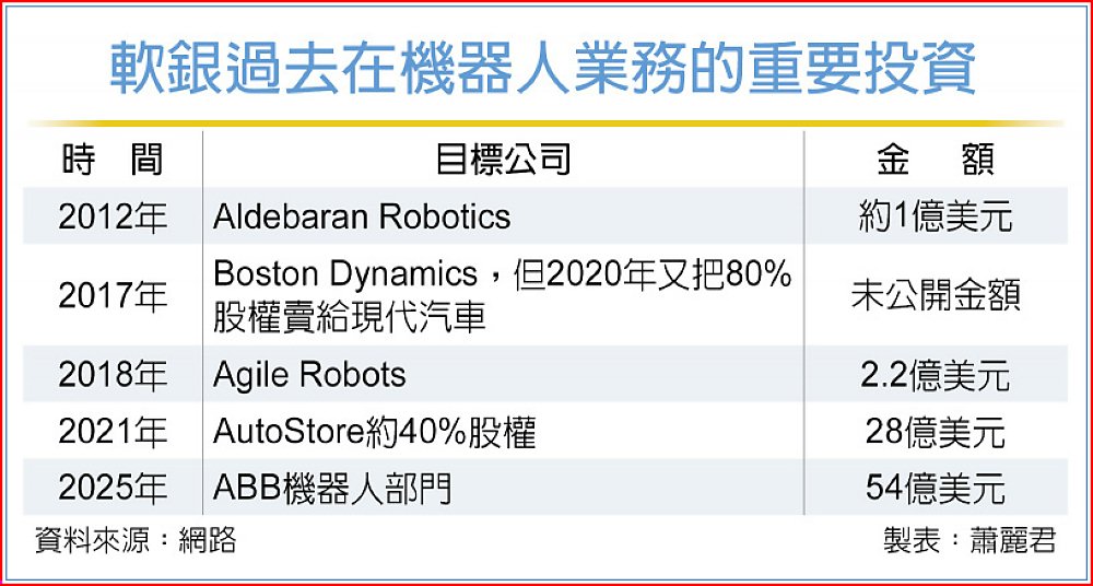 CNBC報導,日本軟銀集團宣布,同意以54億美元收購瑞士工程巨頭ABB的機器人部門,藉此強化在人工智慧(AI)領域的布局。這筆交易仍需通過各國監管機構審批,完成後ABB將不再推動原先的機器人業務分拆上市計畫。