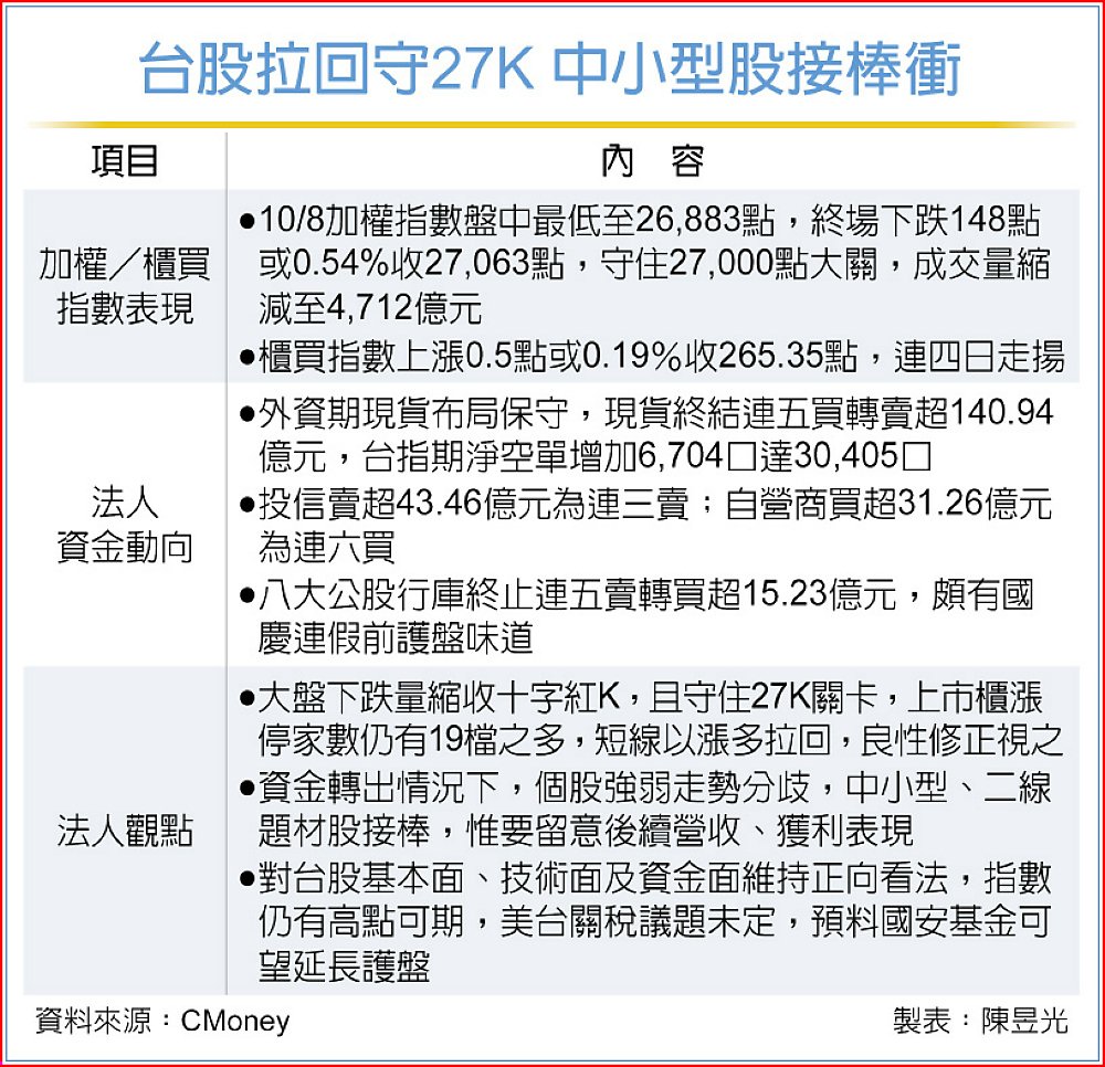 受到甲骨文雲端業務毛利率只有14%,與雙十連假將近影響,台股8日在台積電領跌下開低,一度重挫327點、跌破剛越過的27,000點,但隨即吸引追價買盤與八大公股行庫進場護駕,終場加權指數跌點收斂為148點收27,063點,成功守住27K大關,成交量縮減至4,712億元。