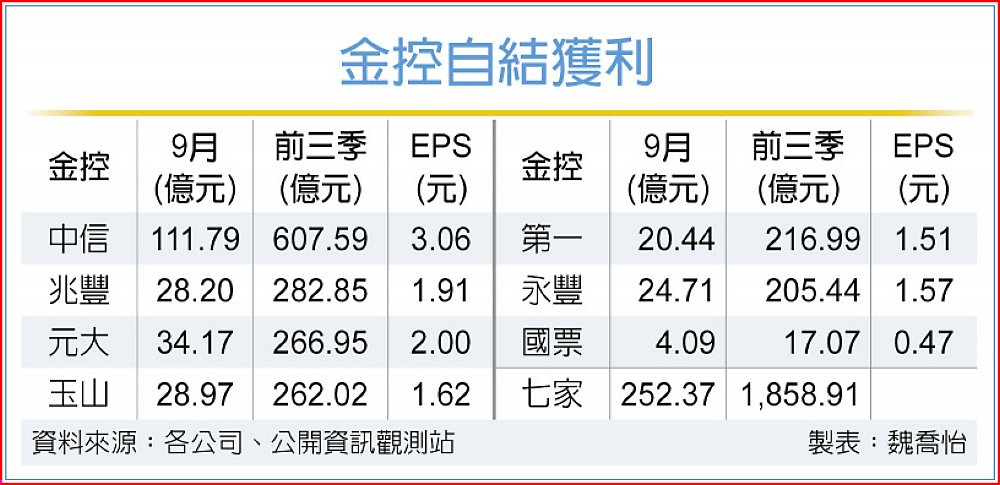 中信金指出,雖然上半年受美元貶值因素,保險承壓,但第三季掌握股市上揚契機,適時實現資本利得,再加上股利入帳以及銀行累計獲利持續創新高,金控前九月獲利刷新歷年紀錄。