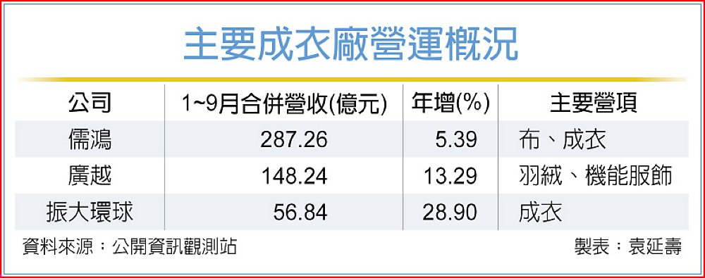 關稅衝擊落底,加上客戶拉貨動能強勁,成衣廠9月業績翻揚,其中儒鴻9月合併營收32.4億元、年增1.59%,創同期新高,振大環球也出現年月雙增,廣越則是創同期次高。