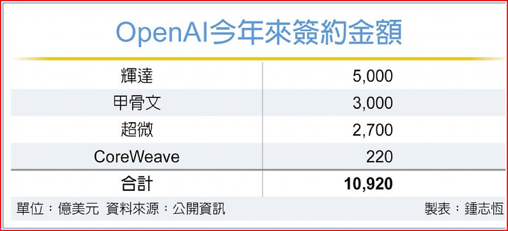 今年以來,OpenAI與超微、輝達、甲骨文和CoreWeave等AI設備商,已累計簽署近1.1兆美元協議,來為其AI模型提供算力。由於相關協議透過採購和認股權證等方式讓設備商利益跟OpenAI未來獲利能力綁一起,令外界憂慮AI泡沫可能愈吹愈大。