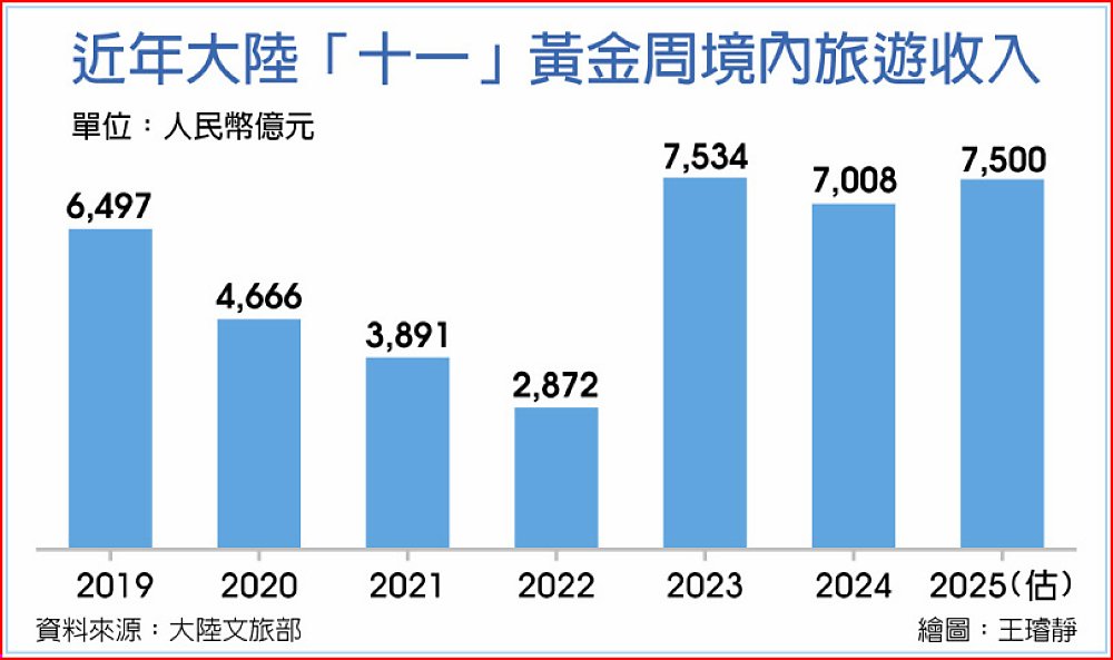 另從旅遊平台數據看出,今年長達8天的假期,為旅客高頻次周邊遊和長線旅遊提供充裕時間和規劃彈性。飛豬平台反映多目的地「串遊」成為新趨勢,期內該平台客單價年增14.6%。美團旅行數據顯示,8天假期帶動平台出行訂單量年增長超30%。