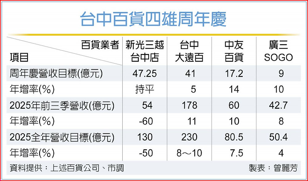 新光三越台中店副店長郭醇貞指出,全台百貨市場前三季整體買氣不如預期,因此台中店今年周年慶訂下「穩健回歸」目標,整檔業績目標為47.25億元、與去年同期持平。她表示,第四季為傳統購物旺季,加上政府普發現金1萬元預計11月中旬上路,可望再掀一波消費熱潮,2025全年營收目標挑戰130億元可期。