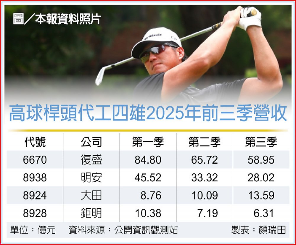 高球桿頭代工四雄第三季「淡季不淡」,明安(8938)、鉅明(8928)9月營收年增,宣告提前脫離淡季,大田(8924)今年營收更呈現季季高的榮景。市場看好隨產業傳統旺季到來,客戶加速拉貨下,明安、鉅明、大田、復盛(6670)第四季業績將攀全年高峰。