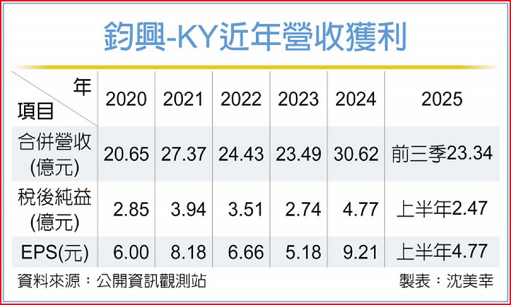 鈞興9月合併營收2.64億元,年增22.28%;第三季合併營收8.07億元,年增12.11%;前三季合併營收23.34億元,年增4.55%。