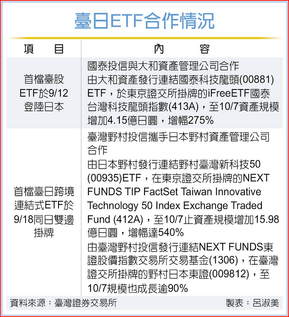 臺灣證券交易所表示,由國泰投信攜手日本大和資產管理公司於9月12日,在東京證交所掛牌的ETF-413A,連結00881國泰台灣科技龍頭ETF,截至10月7日,資產規模增加4.15億日圓,成長幅度高達275%。