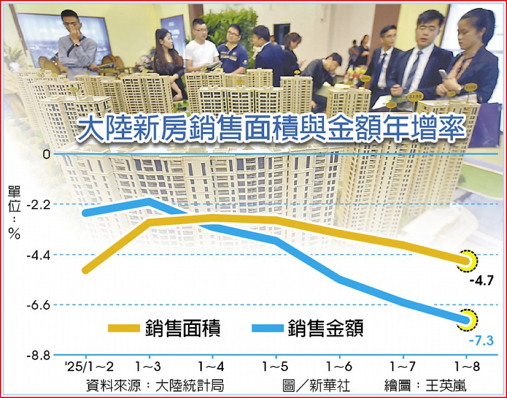從數據看目前大陸房市表現,根據中指研究院數據,9月大陸百城二手住宅均價為每平方公尺13,381元,月減0.74%,年減7.38%,連41個月呈現月減趨勢。新房部分,9月百城新建住宅均價為每平方公尺16,926元,與8月相比保持結構性上漲,月增0.09%,但增幅較上月收窄0.11個百分點,年增2.68%。