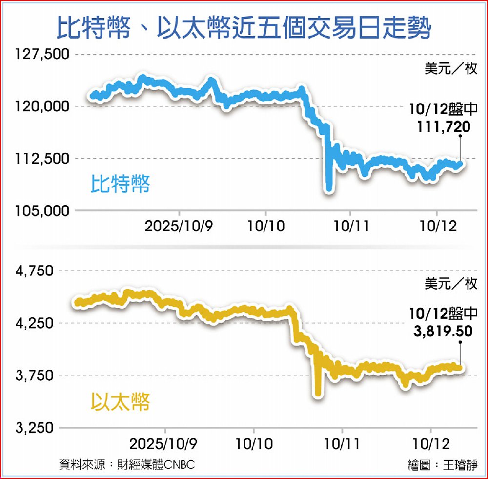 川普10日宣布對中國加徵關稅後,市場恐慌情緒迅速蔓延,全球最大加密通貨比特幣當日跌幅一度達13.5%,最低觸及105,930美元。第二大加密通貨以太幣盤中暴跌超過17%,瑞波幣與狗狗幣重摔逾30%。加密幣市場總市值一日蒸發超過10%。