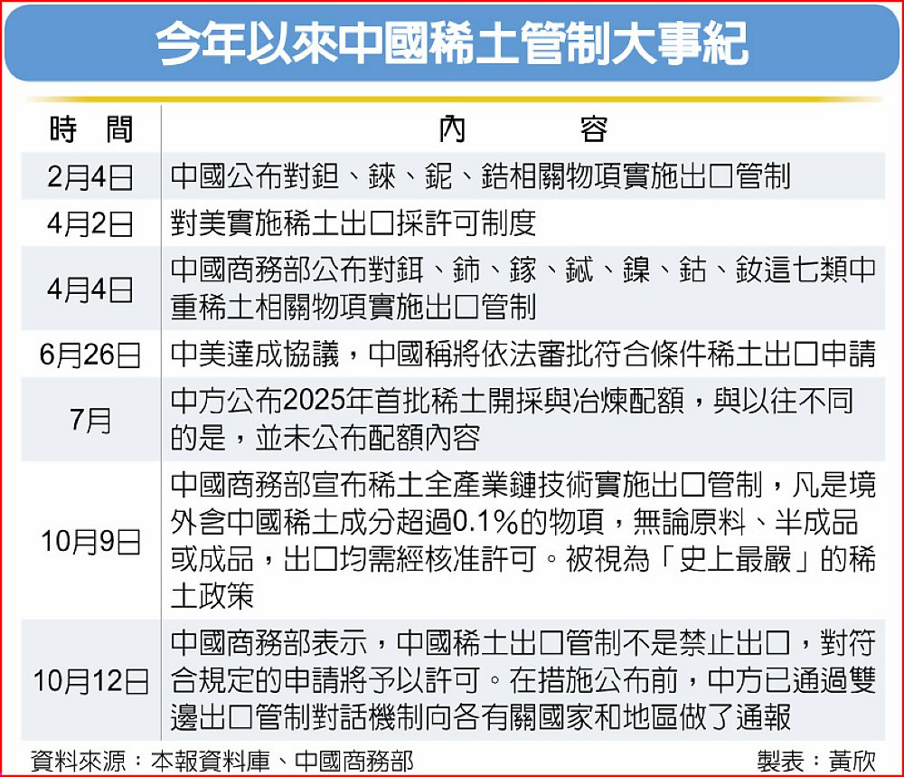 中國9日推出號稱史上最嚴的稀土管控政策,美國總統川普隨即揚言對中國加徵100%關稅,中美恐爆發新一輪貿易戰。對此,中國商務部12日強調,出口管制不是禁止出口,並強調中方事先已就措施的影響進行充分評估,確信相關影響非常有限。中方此番澄清,有意為中美緊張貿易情勢降溫,也讓月底「習川會」如期登場的機會升高。
