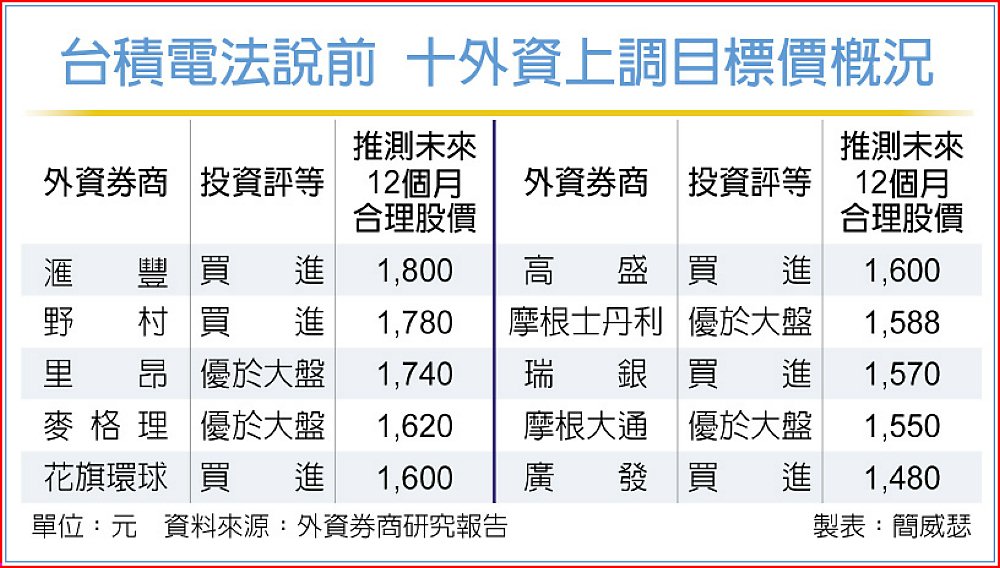 所幸,就算台積電面對外部變數造成股價波動,外資仍全面看多未來營運。主要外資券商包括:摩根士丹利、花旗環球、高盛、廣發、摩根大通、里昂、麥格理、滙豐、野村、瑞銀證券等,賦予台積電的股價預期全面升級,除廣發為1,480元外,其餘全部超越1,500元大關。此外,凱基投顧與大型金控旗下投顧也均在1,500元之上,整體市場最高則是調研機構ALETHEIA的2,100元。