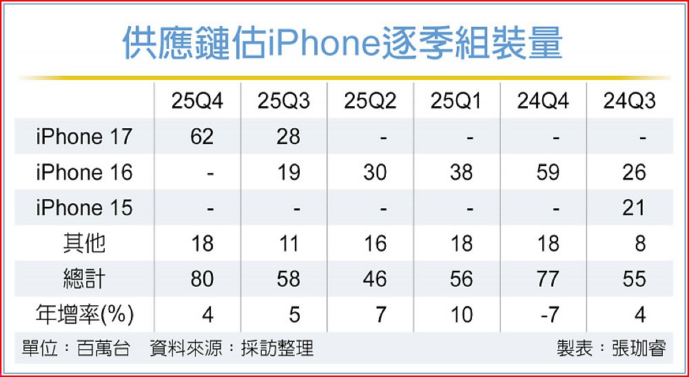 iPhone 17將新科技下放主流機型,據組裝業透露,相較iPhone 16去年第四季組裝量,今年增逾3百萬台,預估整體組裝數量逾6,200萬台。
