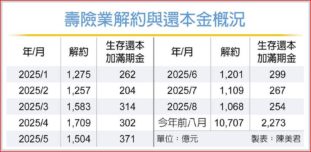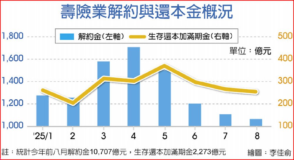 今年前八月,壽險整體現金淨流入6,245億元,較去年全年現金淨流入5,968億元,多了277億元,顯示壽險流動性暫無疑慮。單看8月壽險解約減至1,068億元,連四月下滑,且是一年半來的最低水準;生存還本加滿期金約254億元,也寫下半年新低水準。