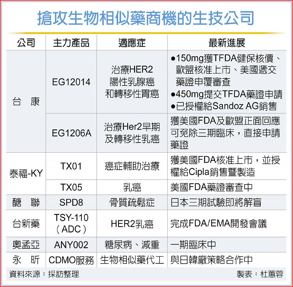 全球生物藥專利潮即將掀起第二波到期浪潮,估計達上百億美元商機誘人,加上歐美等法規機構調整審查策略,讓「三期臨床豁免」與「分析比對為主」的新模式逐漸成為主流,帶動生物相似藥廠群起競進,台康生、泰福-KY、醣聯、台新藥力拚打進國際賽局。