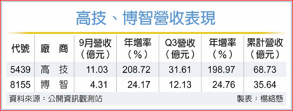 AI伺服器網通需求持續火熱,PCB供應鏈再交出亮眼成績。高技(5439)、博智(8155)9月營收雙雙改寫單月歷史新高,反映AI伺服器主板與網通板接單暢旺,推升第三季營運同步登峰。今年以來兩家公司均受惠美系雲端及ASIC伺服器平台拉貨動能,下半年產能滿載、毛利率穩步提升,整體營運維持高檔態勢。