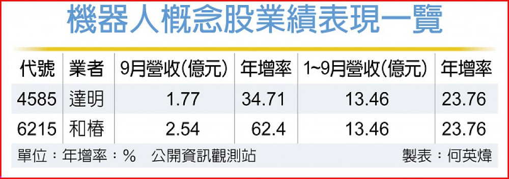達明機器人上月剛掛牌,公告9月營收1.77億元,年增34.7%,該公司第三季營收4.55億元,較上季成長15.1%,年增244%,累計前九月營收13.46億元,年增23.76%。