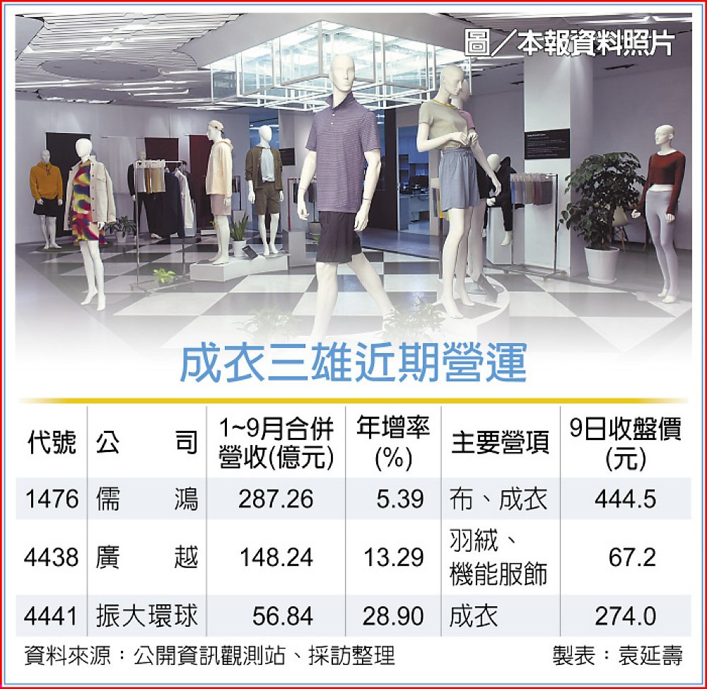 關稅底定,品牌服飾廠拉貨動能恢復,成衣族群儒鴻(1476)、廣越(4438)、振大環球(4441)第三季營運攀高,在動能延續下,成衣廠樂觀第四季可續寫佳績。