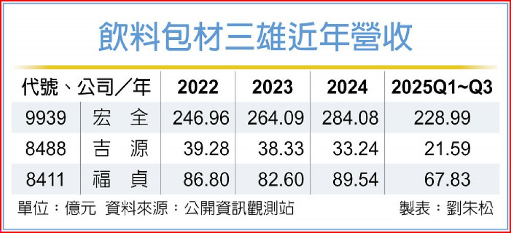 三大飲料飲品包材廠宏全(9939)、福貞-KY(8411)、吉源-KY(8488)拜天氣炎熱所賜,飲料飲品需求強勁,帶動9月合併營收聯袂成長。福貞9月合併營收8.3億元、年增18.24%,累計前三季合併營收67.83億元、年增4.75%,單月與累計合併營收均創同期新高。