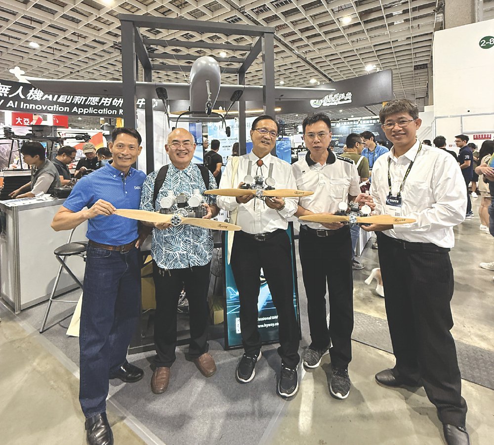 彰化無人載具聯盟顧問游富洋(左二)與彰化市長林世賢(中)出席上月國防航太展,關心聯盟廠商無人機研發成果與產業發展。圖/王妙琴
