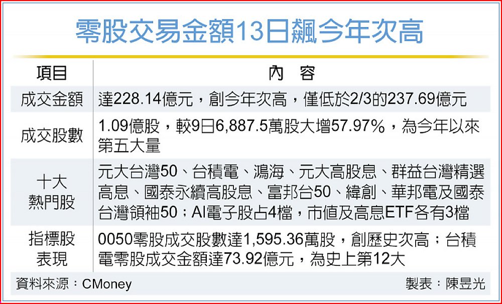 尤其10月13日、蓄積近半年的小資族「螞蟻雄兵」力量湧現,零股交易爆出228.14億元,為今年來次高,僅低於2月3日的237.69億元;成交股數約1.09億股為今年第五大量。