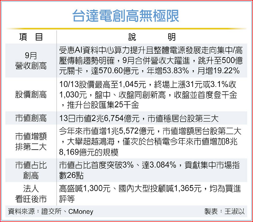 AI電力王者再創奇蹟。台達電在AI伺服器與資料中心需求推升下,9月合併營收衝上570.6億元,創歷史新高,帶動13日股價飆漲31元或3.1%、收1,030元,首度收盤登上千金行列,市值同步衝高至2兆6,754億元,占台股上市市值比重亦首度突破3%、達3.084%,在台股重挫中一舉締造「營收、股價、市值」三冠王紀錄,成盤面焦點。