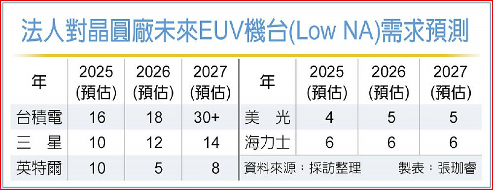 據設備業者透露,該EUV機台每小時產能(WPH)約為195片晶圓,後續可提升至220片。Intel 18A月產能預估將於年底起以每月1,000至5,000片速度拉升(ramp-up),2026年上看1萬至1.5萬片,2027年後可達3萬片水準,並預留再添兩台EUV的空間。