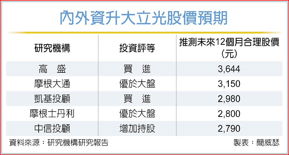 大立光法說會後,具代表性的多頭派外資高盛、摩根大通證券,維持3字頭的樂觀基調,並將股價預期分別上調為3,644元與3,150元,摩根士丹利證券維持「優於大盤」投資評等,凱基投顧則把股價預期升到2,980元,直逼3,000元大關,中信投顧則是著眼鏡頭升級趨勢不變,看好大立光龍頭地位穩固,將投資評等由「中立」調高到「增加持股」。