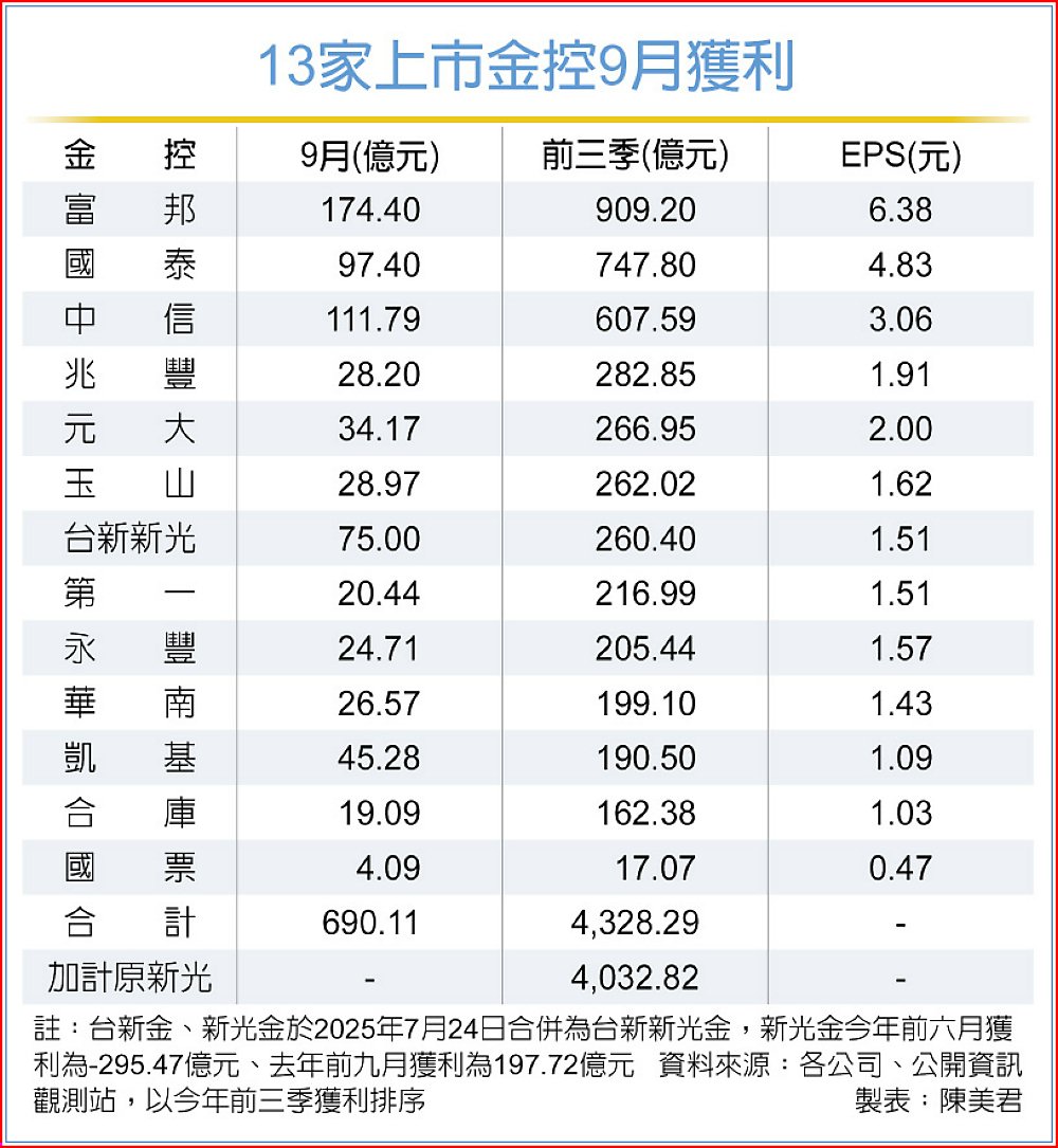 上市金控獲利13日全數出爐。受惠台股指數屢創新高,金控資本利得豐厚,9月交出亮眼獲利成績單,13家金控合計稅後純益達690.11億元,年增87.61%,但與去年同期相較,前三季累計賺進4,032.82億元、年減19.5%。