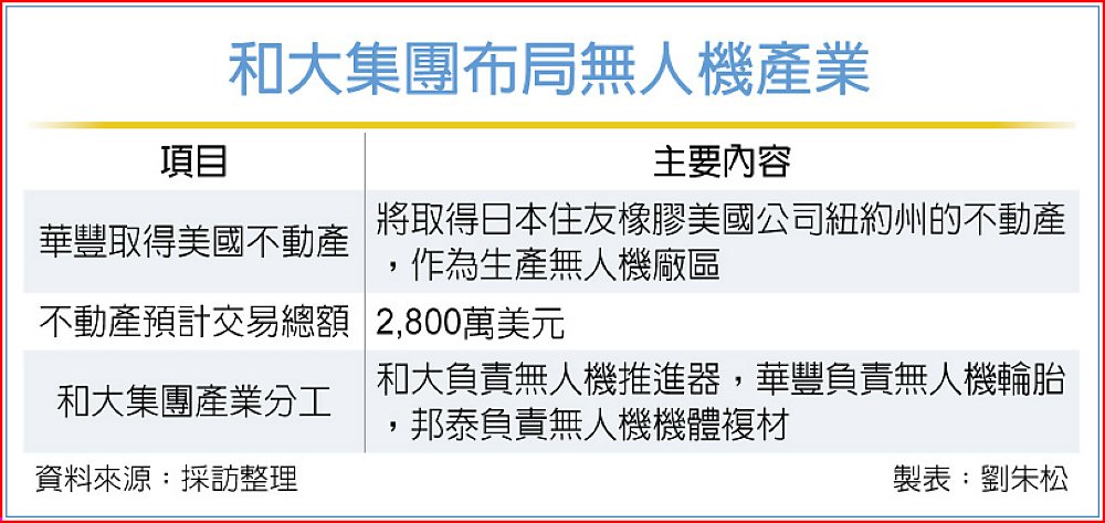 和大集團旗下上市輪胎廠華豐13日召開重訊記者會,總經理王嶠奇宣布,華豐董事會通過將斥資2,800萬美元,取得日本住友橡膠美國公司在紐約州的不動產,全案將送12月1日股東臨時會表決。據了解,未來取得的住友水牛城廠除將成為華豐在美輪胎生產基地外,其廠區尚有大面積未開發區域,將作為和大集團的美國無人機產業基地使用。