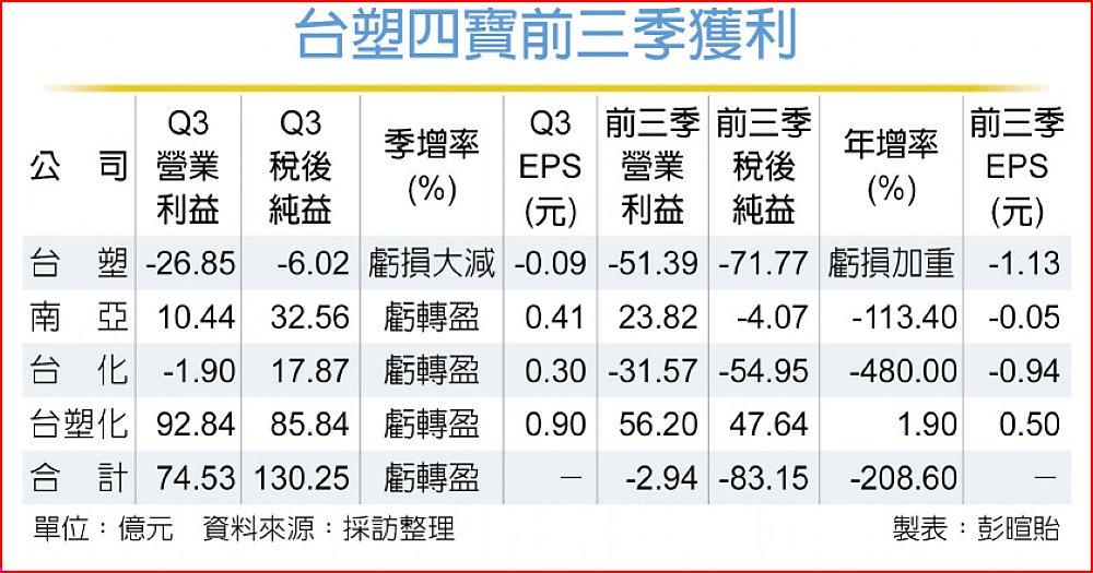 南亞因高階電子材料產品利益增加、塑膠加工獲利穩定,且轉投資南亞科及台塑化營運轉盈,第三季EPS達0.41元,為近八季新高;前三季每股純損0.05元。台化第三季轉虧為盈,EPS為0.3元,前三季每股純損0.94元。台塑第三季每股純損0.09元,前三季每股純損1.13元。