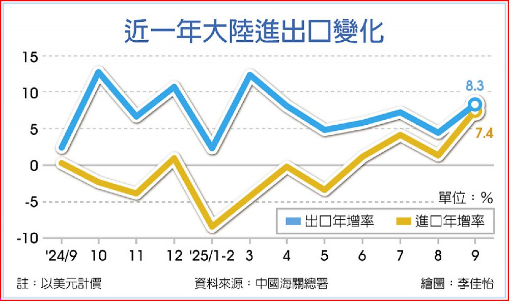 中國9月份外貿成績亮眼。中國海關總署13日公布最新數據,以美元計,9月份出口年增8.3%,較上月大幅增長3.9個百分點,優於市場預期的6.6%。進口年增7.4%,增速較上月增漲6.1個百分點,高於市場預期的1.8%。