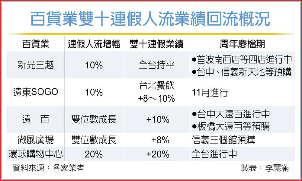 今年雙十連假適逢不少百貨業者周年慶,或操作周慶前預購活動,各大百貨人流明顯回升,人潮比中秋連假更多,且預購業績普遍增長,並出現久違的精品大單。