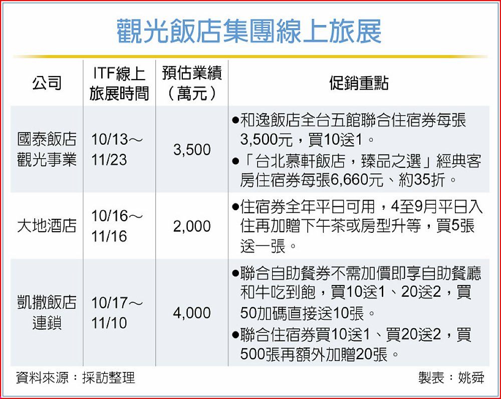 國泰飯店觀光事業今年線上旅展總營收目標為3,500萬元,較去年成長16%。