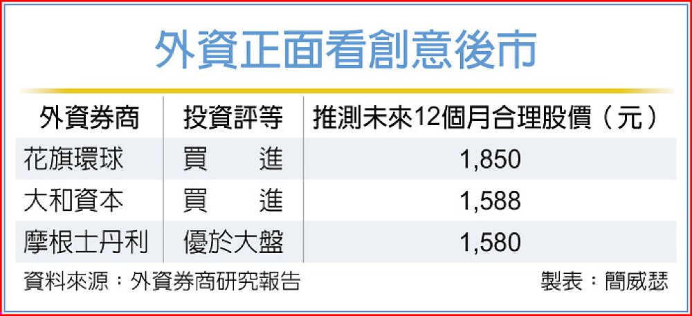 高價IP投資風向轉變,創意(3443)近期改寫波段新高,儘管13日受美股大跌影響拉回,跌幅仍有效縮減。花旗環球證券預料,創意明年可望恢復強勁增長,升評「買進」、推測合理股價1,850元,加上大和資本、摩根士丹利證券同步青睞,創意投資氣氛相當正面。