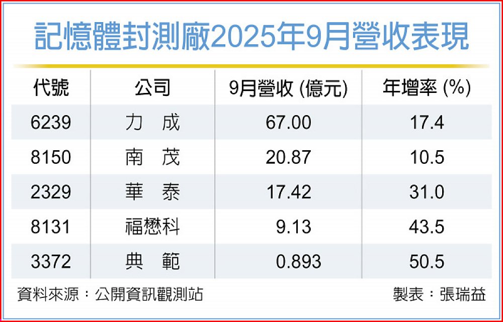 受惠AI伺服器、高效運算需求爆發,記憶體價格近月明顯走揚,市場看好這波熱度將一路延續至明(2026)年。隨記憶體顆粒價格全面調漲,台系記憶體封測廠接單同步增溫並帶動9月營收強勁成長,包括力成(6239)、南茂(8150)、華泰(2329)、福懋科(8131)及典範(3372)等9月營收均繳出年增雙位數起跳的亮眼成績,顯示記憶體封測鏈全面受惠。