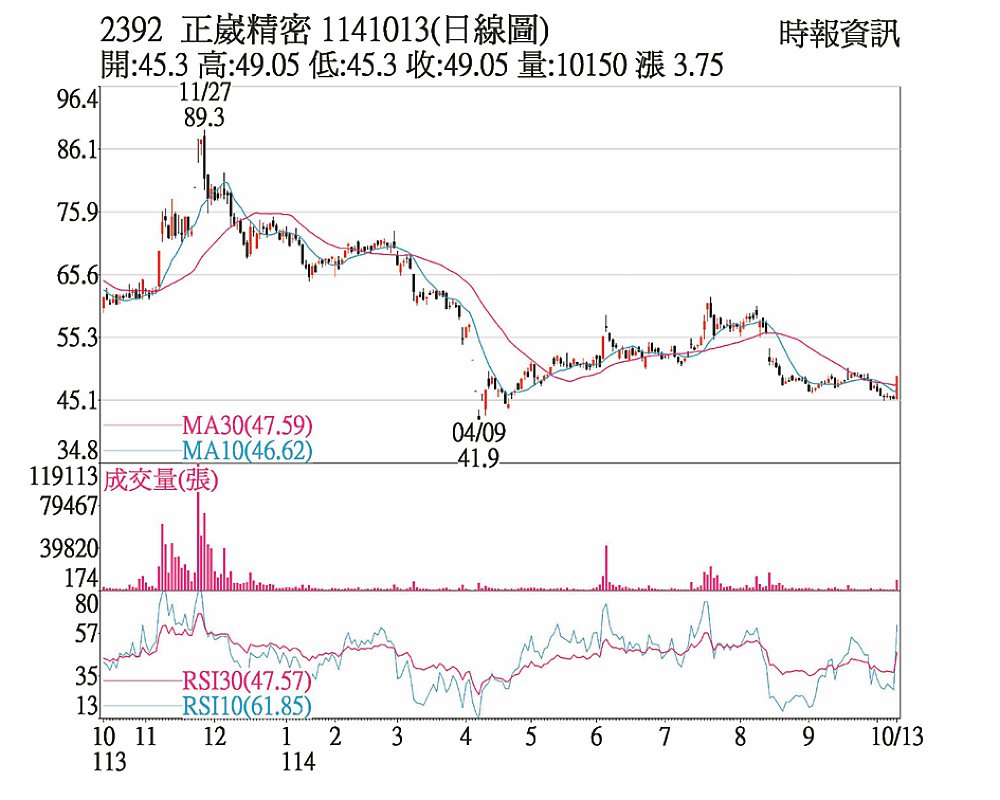 正崴13日展現抗跌氣勢,終場勁揚逾8%,以49.05元作收,日KD擺脫連黑,低檔拉出一根長紅K棒,成交量衝逾1萬張以上,創下近期大量,目前日K、周K均呈現黃金交叉,技術線型有利於多頭。