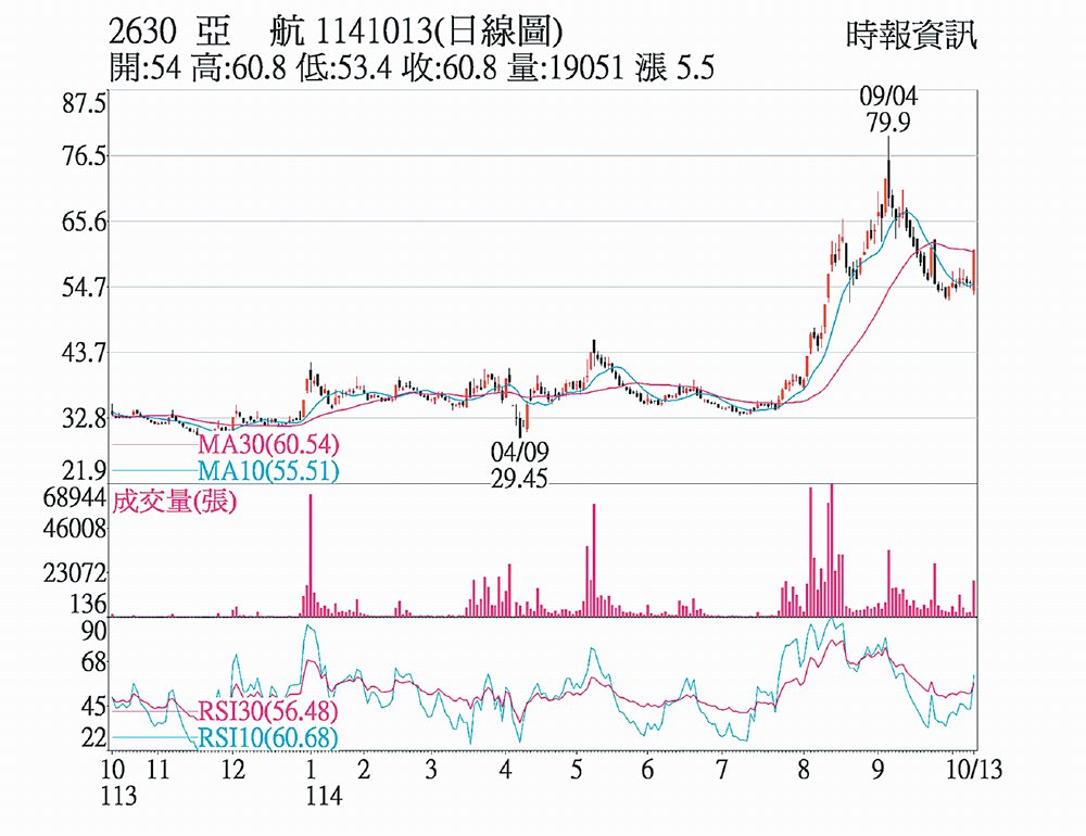 亞航(2630)受惠於總統國慶演說提及打造「台灣之盾」,激勵軍工族群表現,13日股價逆勢勁揚,在外資、自營商聯袂買超助威下,上午11時31分攻上漲停價,並鎖死至收盤,終場收漲停價60.8元,成交量逾1.9萬張。