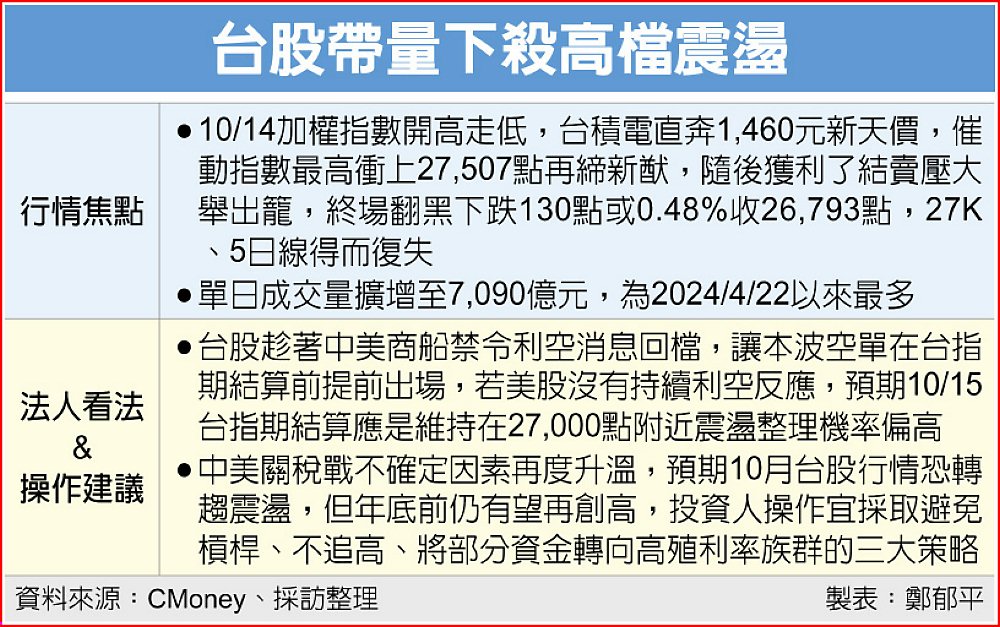台股14日開盤氣勢如虹,加權指數大漲收復27,000點整數大關,並在台積電改寫新天價催動下最高直奔27,507點,再寫新高,盤中川湖、緯穎、穎崴、旺矽、台積電、奇鋐、富世達、貿聯-KY、台達電等9檔千金股股價改寫掛牌新高,但中美相互制裁拖累,連同台股開高走低並帶量下殺,加權指數留長達225點黑K上影線;日、港股跌幅則重於台股。