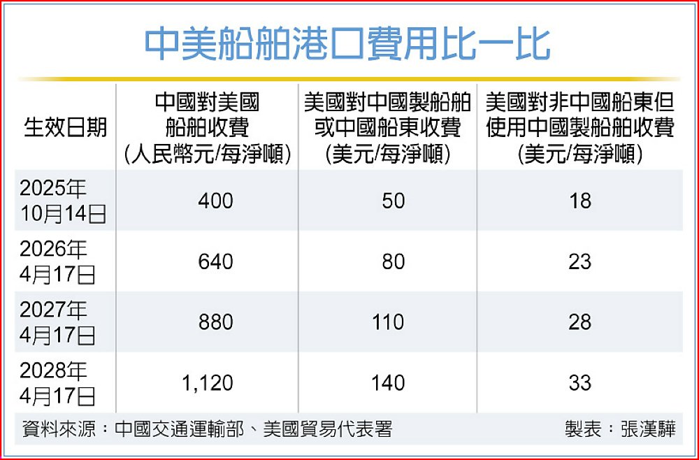 外媒報導,中美14日同步對海運業者祭出額外港口費用,從節慶玩具到原油運輸皆受影響。中國交通運輸部表示,美方徵收港口費「嚴重違反國際貿易原則,嚴重損害中美海運貿易秩序」,因此中方採取對等回應,對美國擁有、經營、建造或懸掛美國船旗的船舶徵收特別港口費,但強調「中國自建船舶、空船進入中國船廠維修,列豁免範圍。」