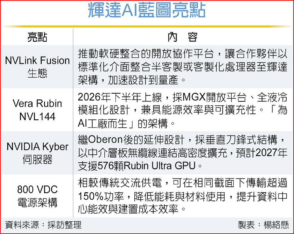 台廠聯發科、貿聯-KY入列電源供應鏈成員,英特爾及三星成為NVLink Fusion新成員。光寶科展示次世代MGX整機級解決方案,鴻海亦宣布攜手輝達導入800 VDC電力架構,共同打造未來AI Factory基礎設施,並將導入於高雄K-1專案的AI資料中心實施,成為兆瓦級建置示範案例。