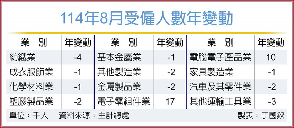 她以8月受僱人數為例指出,紡織業年減4千人、其他運輸工具業年減3千人,金屬製品業、塑膠製品業、汽車及零件製造業各年減2千人,此外,成衣服飾、基本金屬、化學材料業也各年減1千人。